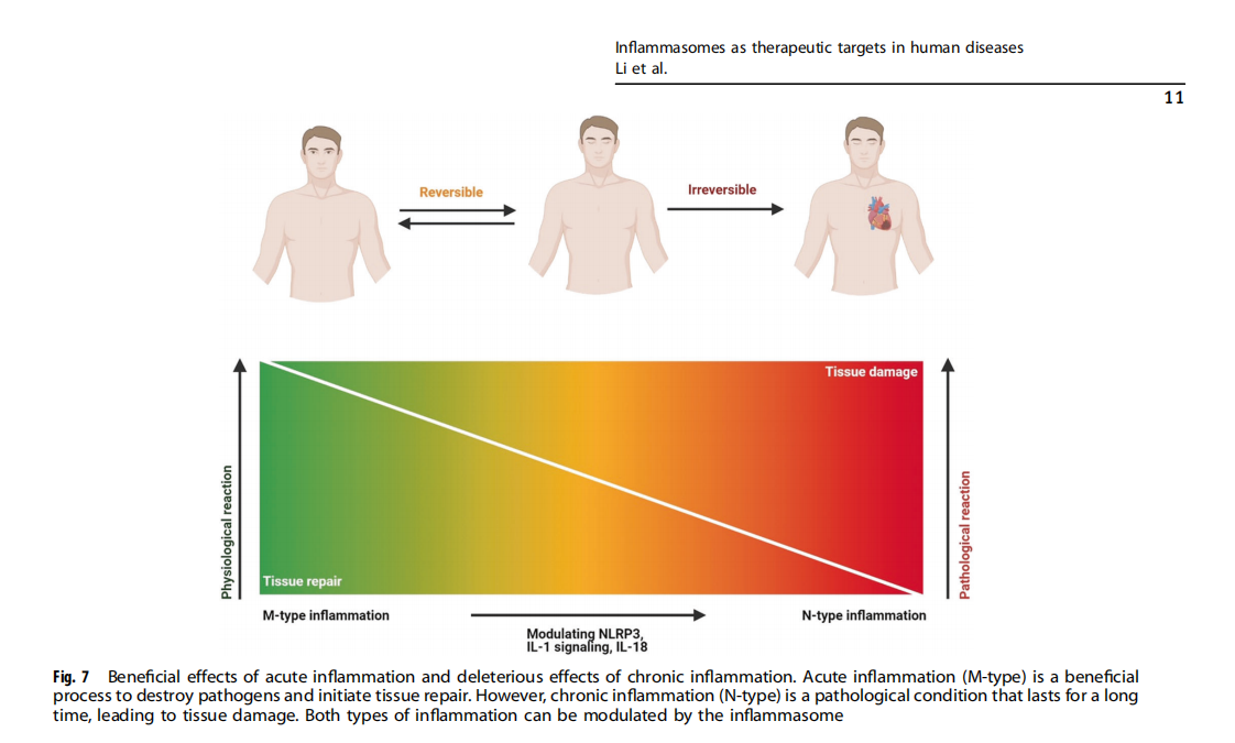 Activation of inflammasomes in acute diseases helps to remove dead cells and initiate tissue repair. However, persistent activation of inflammasomes in chronic diseases is detrimental because it damage tissues (Fig. 7). In order to explore the potential of inflammasomes as therapeutic targets, a greater understanding of the signaling molecules mediating the beneficial and detrimental effects of their activation is needed.