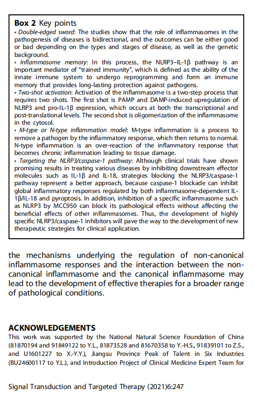 In summary, NLRP3 acts as a nodal factor which can be beneficial after either activation or inhibition. Aberrant NLRP3 activation is implicated in chronic inflammation that leads to the development of cancer, aging, and degenerative diseases. IL-1 blockers such as canakinumab, anakinra, and rilonacept are only effective in treating certain NLRP3-mediated diseases. The development of more effective treatment relies on a thorough understanding of the signaling pathways triggering the activation of the inflammasome (Box 2). In addition, a better understanding