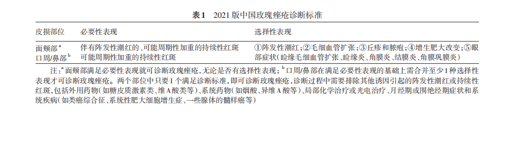 目前很多国家制定了玫瑰痤疮诊疗指南,如加拿大、瑞士、荷兰等[32] ,但国际上较为公认的诊断标准是美国国家玫瑰痤疮专家委员会提出的2002版[29] 和2017版标准[30] ,现以2017版为国际通用标准。2017 版诊断标准提出,面中部可能周期性加重的持续性红斑及增生肥大改变为玫瑰痤疮的2个诊断性特征,符合1条及以上,就可以诊断玫瑰痤疮;阵发性潮红、丘疹和/或脓疱、毛细血管扩张和部分眼部表现(睑缘毛细血管扩张、睑缘炎、角膜炎、结膜炎和角膜巩膜炎等)为玫瑰痤疮的主要特征,2 条及以上的主要特征可提示玫瑰痤疮诊断。