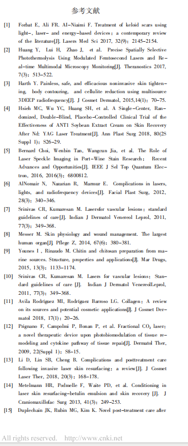3.2.3 促进愈合 目前有各类修复材料用于临床。术后可外喷成纤维细胞生长因子(FGF)、表皮细胞生长因子(EGF)或各类具有促进创面愈合的其他生长因子,以加快创面的愈合。此外,多项研究表明,激光术后使用医用冷贴敷,植物水凝胶冷敷贴等在抗炎、抗感染、止血、收敛以及加速创伤愈合等方面都有积极作用[11]。