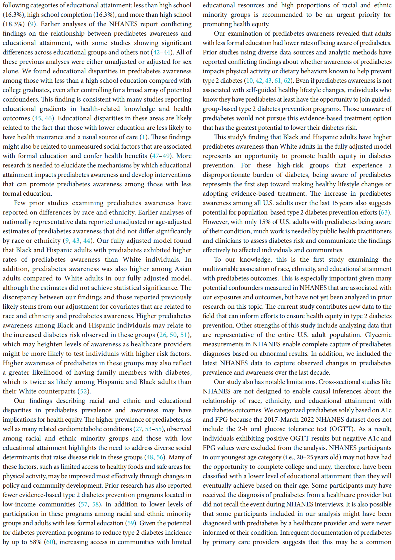 Discussion: Disparities in prediabetes among racial and ethnic minority groups and adults with low educational attainment suggest challenges and opportunities for promoting health equity in high-risk groups and expanding awareness of prediabetes in the United States.