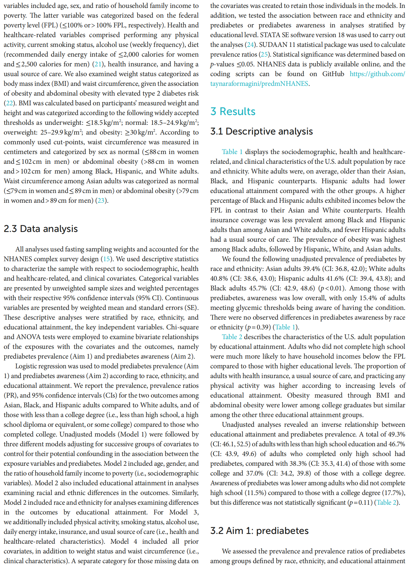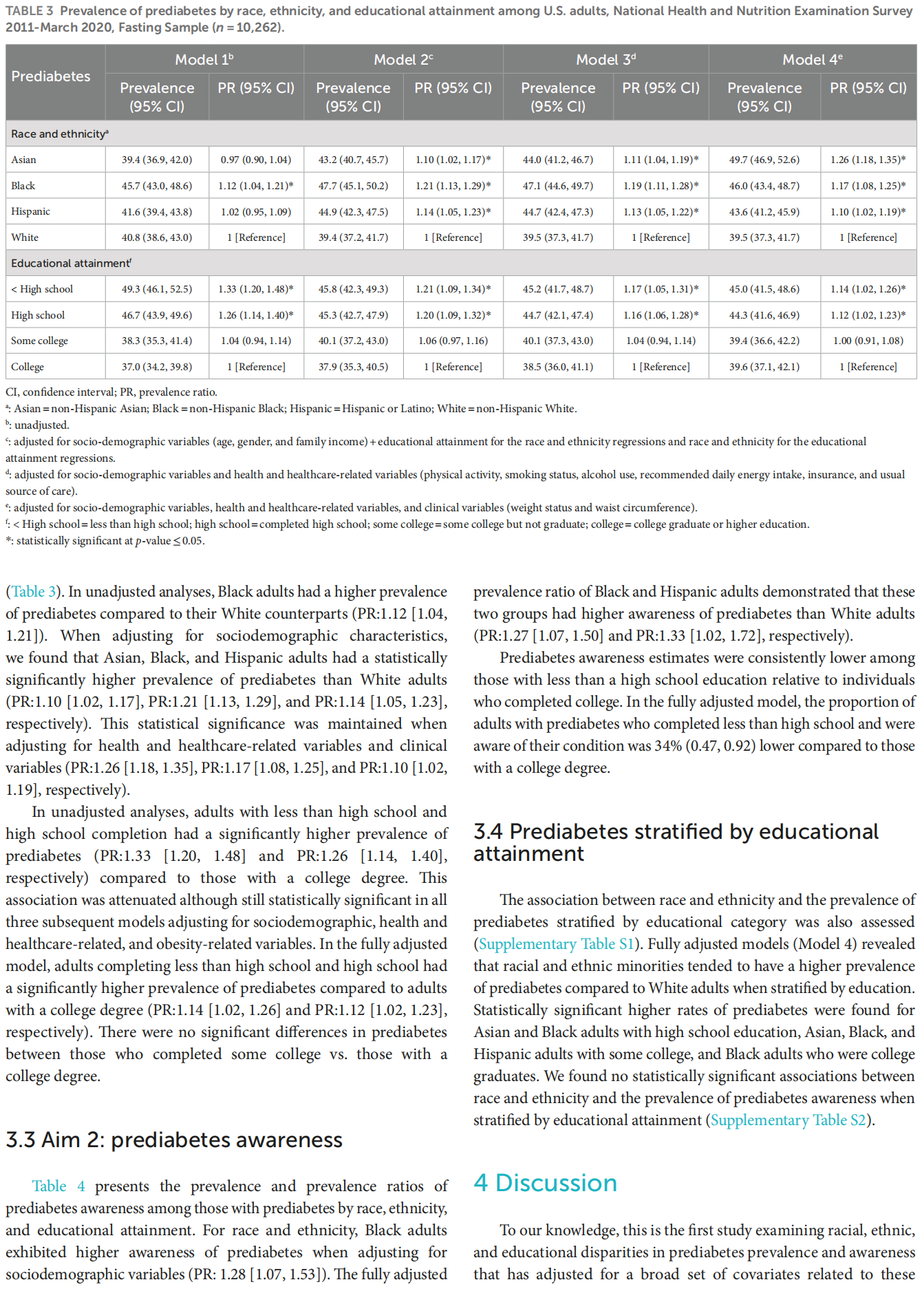 Results: In fully adjusted logistic regression models, Asian, Black, and Hispanic adults had a statistically significant higher risk of prediabetes than White adults (PR:1.26 [1.18,1.35], PR:1.17 [1.08,1.25], and PR:1.10 [1.02,1.19], respectively). Adults completing less than high school and high school had a significantly higher risk of prediabetes compared to those with a college degree (PR:1.14 [1.02,1.26] and PR:1.12 [1.01,1.23], respectively). We also found that Black and Hispanic adults had higher rates of prediabetes awareness in the fully adjusted model than White adults (PR:1.27 [1.07,1.50] and PR:1.33 [1.02,1.72], respectively). The rates of prediabetes awareness were consistently lower among those with less than a high school education relative to individuals who completed college (fully-adjusted model PR:0.66 [0.47,0.92]).