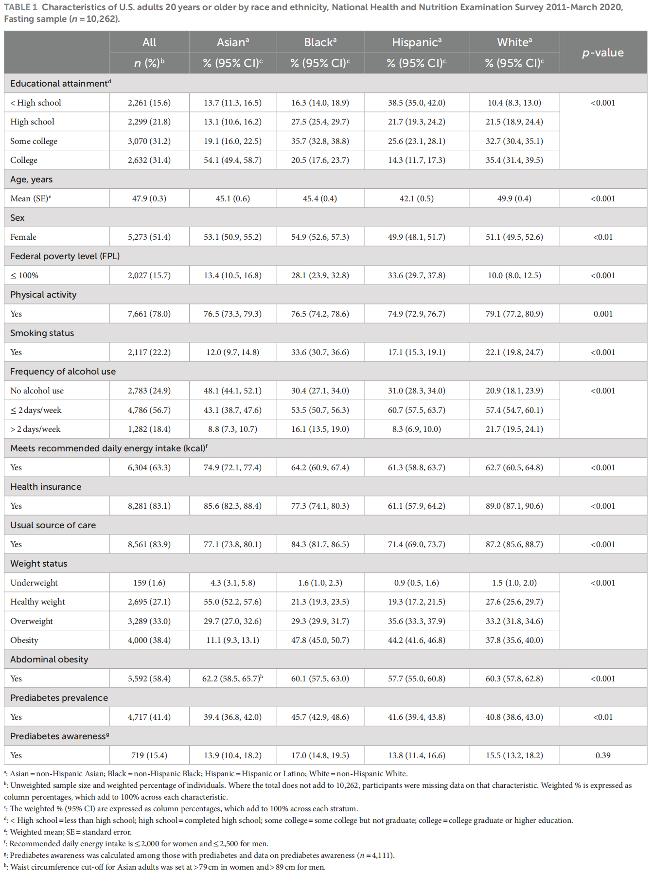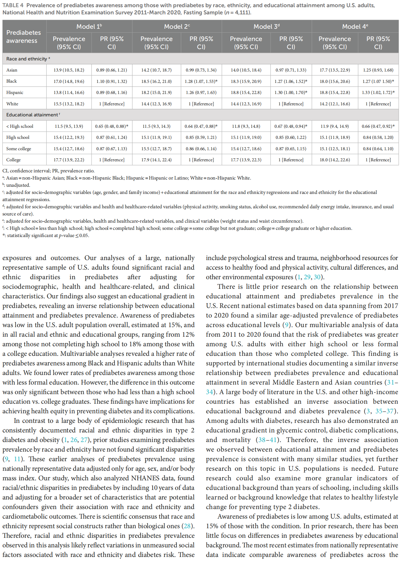 Methods: This study was a pooled cross-sectional analysis of the National Health and Nutrition Examination Survey data from 2011 to March 2020. The final sample comprised 10,262 U.S. adults who self-reported being Asian, Black, Hispanic, or White. Prediabetes was defined using hemoglobin A1c and fasting plasma glucose values. Those with prediabetes were classified as “aware” or “unaware” based on survey responses. We calculated prevalence ratios (PR) to assess the relationship between race, ethnicity, and educational attainment with prediabetes and prediabetes awareness, controlling for sociodemographic, health and healthcare-related, and clinical characteristics.